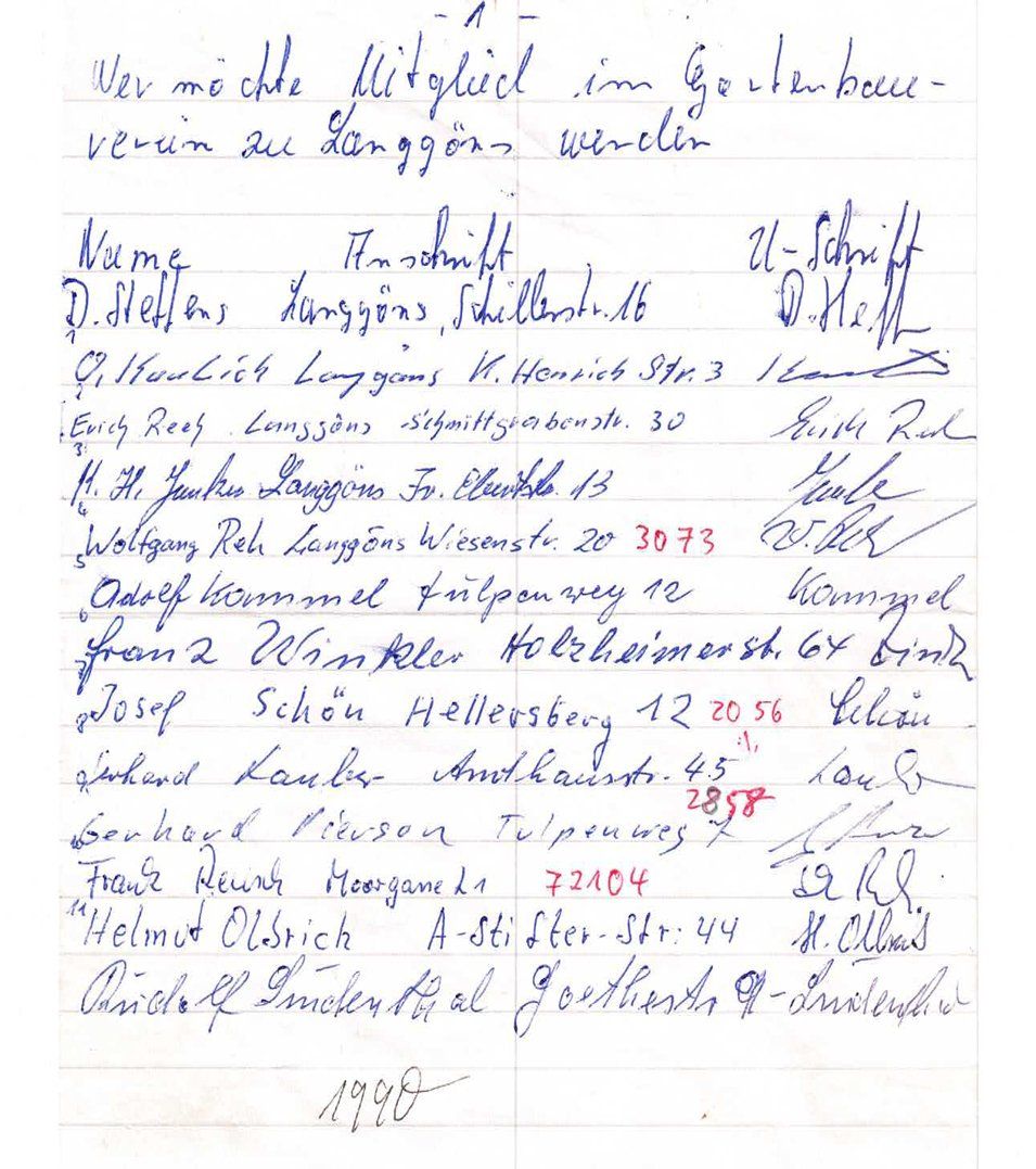 On March 14, 1990, 13 participants met in the classroom of the fire station to found the fruit and horticultural association in Langgöns. It was the 50th club of its kind in the Gießen district. Dietrich Steffens was elected chairman. Second chairman was Frank Reusch, treasurer Gerhard Pierson, assessors Wolfgang Reh and Gerhard Lauber.