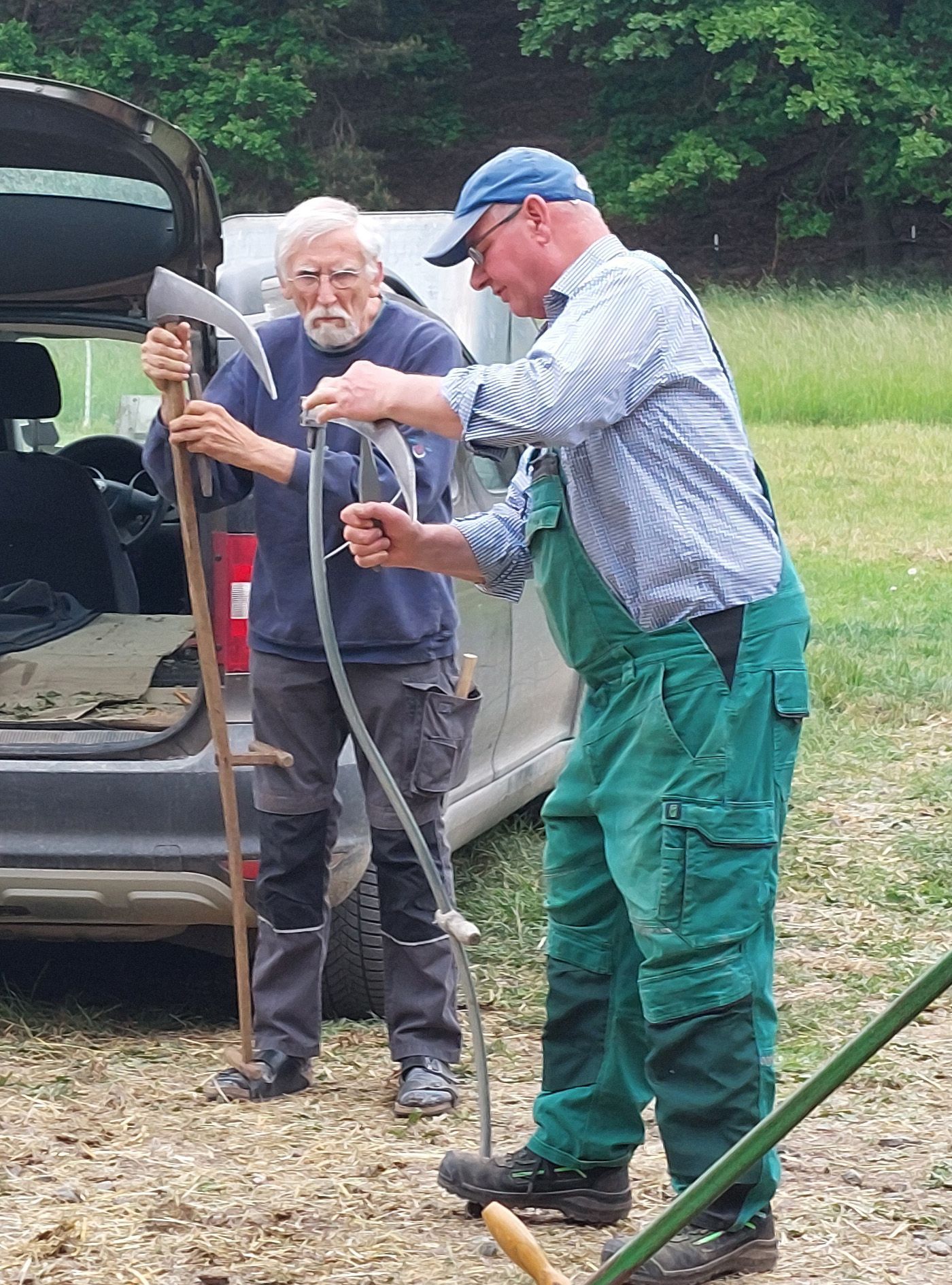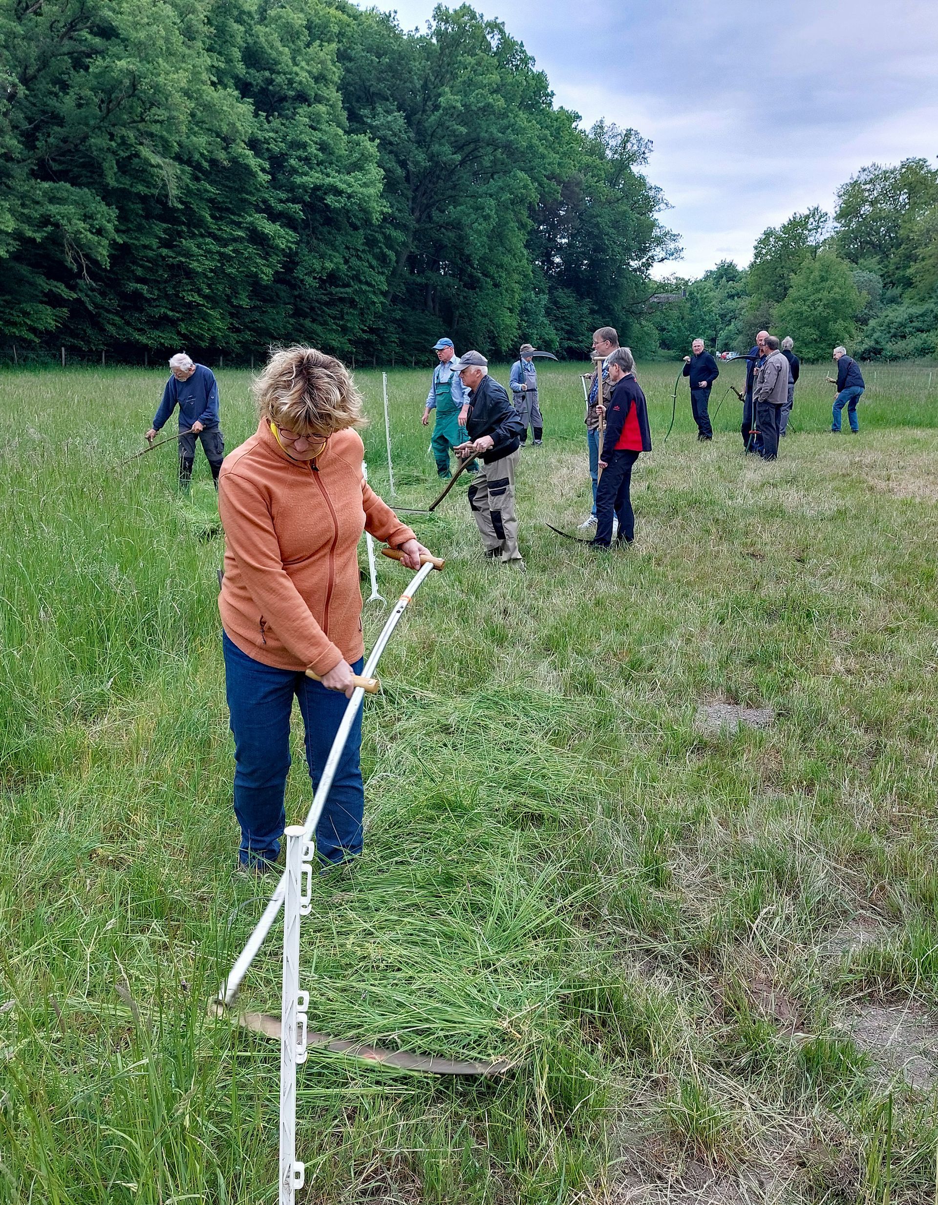 Hinten runter, vorne hoch, Körper drehen, nicht hauen, nicht zu viel mitnehmen: auf der Wiese hallen die Anweisungen von Lehrgangsleiter "Didi" Steffens weit hörbar. Zuvor hat er das richtige Dengeln erklärt.